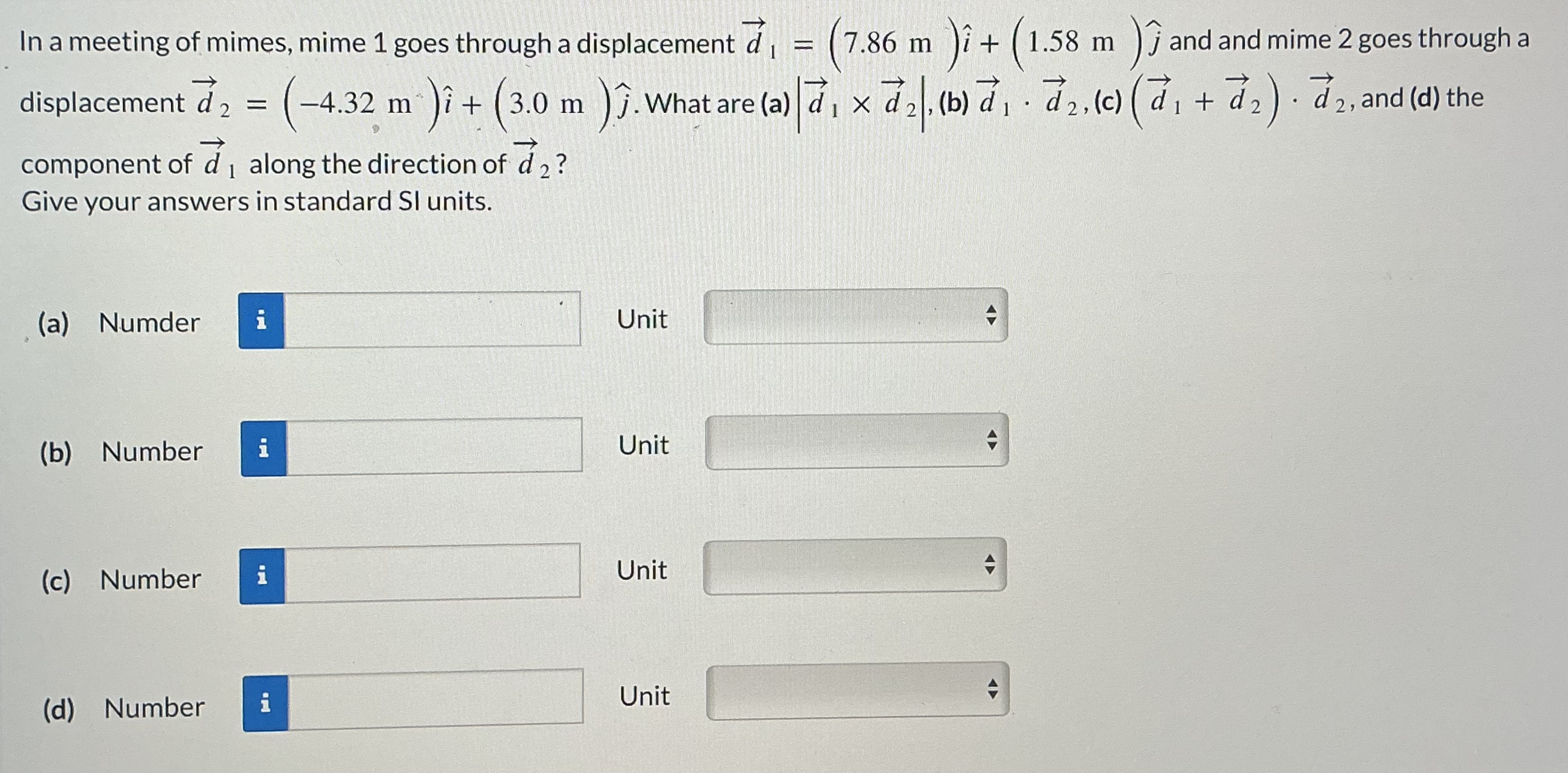 In a meeting of mimes, mime goes through a displacement vec and and mime goes through adisplacement vec What are avecb veccvec and d thecomponent of vec along the direction of vecGive your answers in standard SI units.a Numderb Numberc Numberd NumberUnitUnitUnitUnit- There are 2 steps to solve this one.SolutionStep 1View the full answerExplanation: