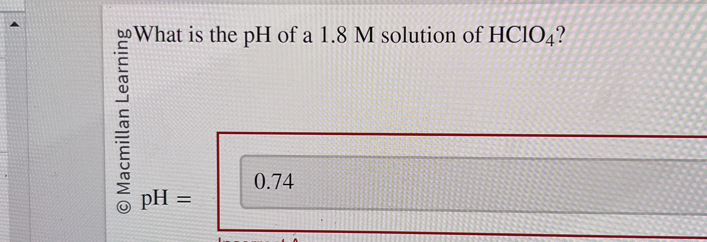See AnswerSee Answer done loadingQuestion: ?00 What is the pH of a 1.8 M solution of HClO4 ?pH=0.74