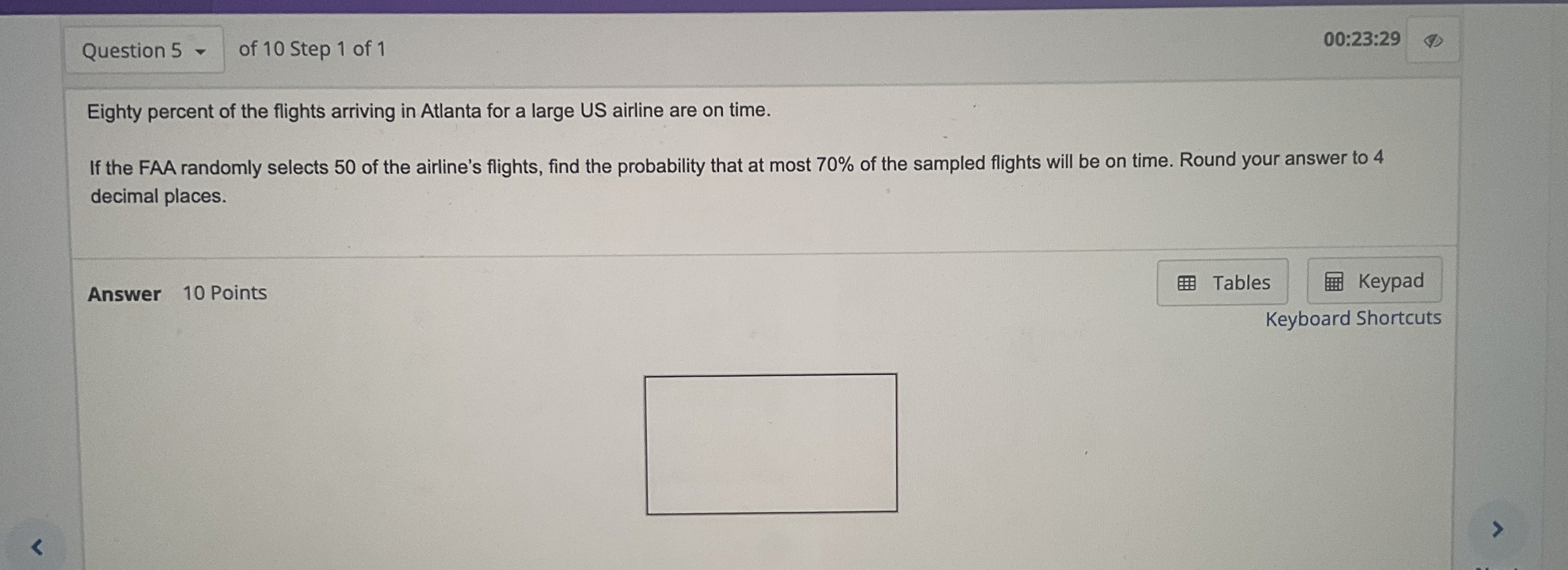 See AnswerSee Answer done loadingQuestion: Eighty percent of the flights arriving in Atlanta for a large US airline are on time.If the FAA randomly selects 50 of the airline's flights, find the probability that at most 70% of the sampled flights will be on time. Round your answer to 4decimal places.Answer 10 Points
