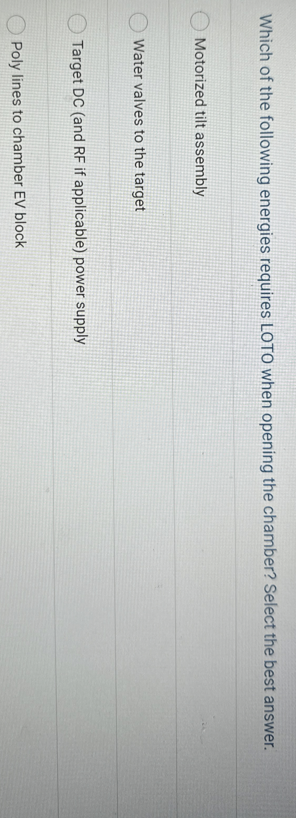 See AnswerSee Answer done loadingQuestion: Which of the following energies requires LOTO when opening the chamber? Select the best answer.Motorized tilt assemblyWater valves to the targetTarget DC (and RF if applicable) power supplyPoly lines to chamber EV block