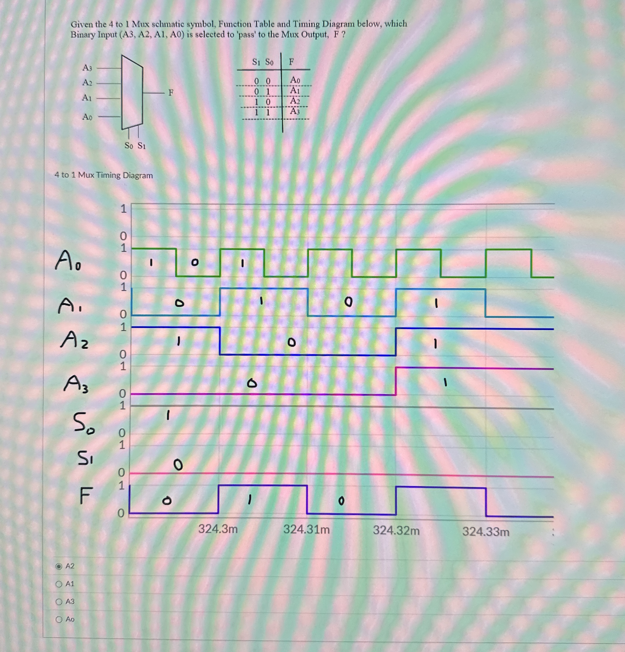 Question: Given the 4 to 1 Mux schmatic symbol, Function Table and Timing Diagram below, whichBinary Input (A3, A2, A1, A0) is selected to 'pass' to the Mux Output, F?4 to 1 Mux Timing DiagramA2A1A3Ao
