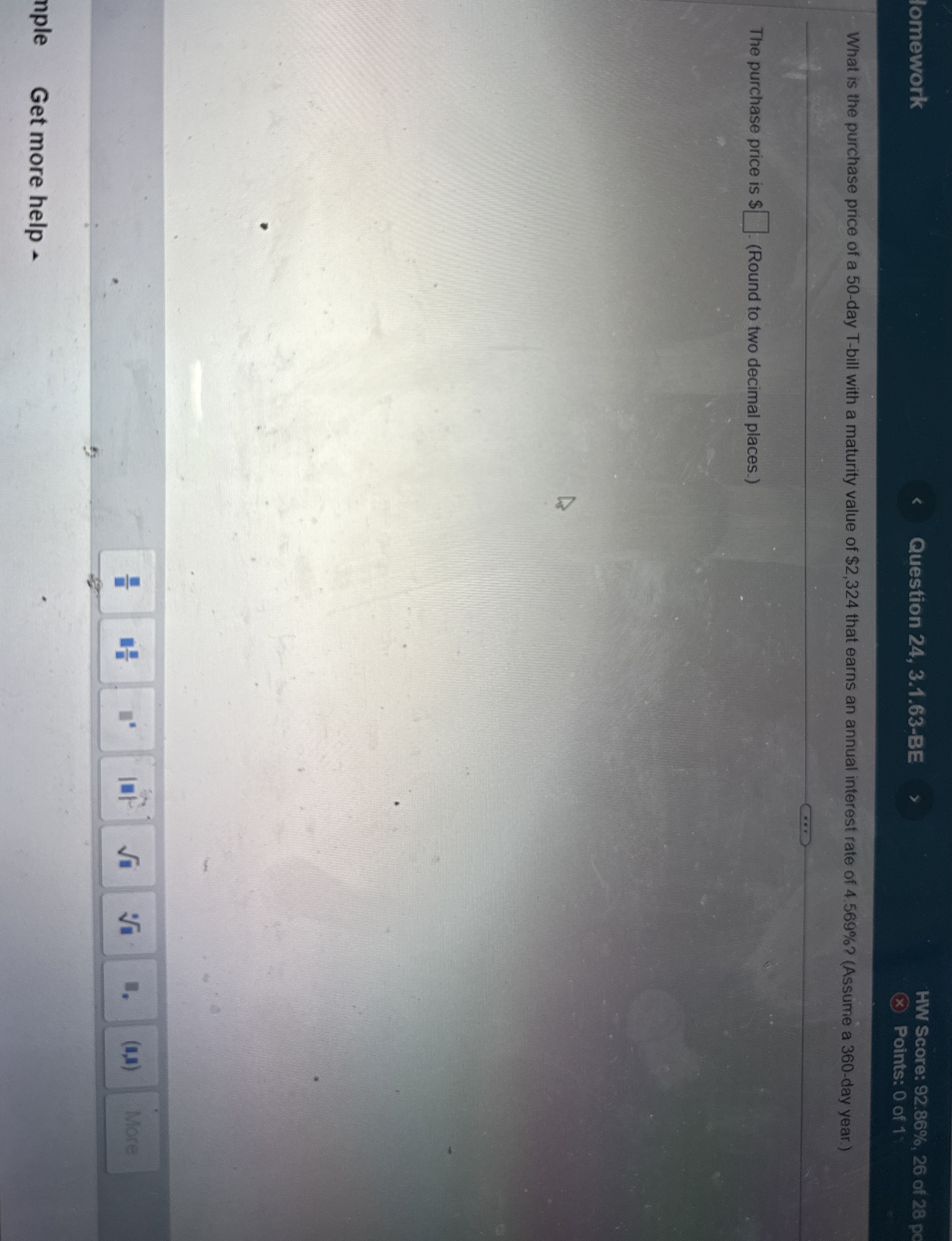 See AnswerSee Answer done loadingQuestion: What is the purchase price of a 50 -day T-bill with a maturity value of $2,324 that earns an annual interest rate of 4.569% ? (Assume a 360 -day year.)The purchase price is $(Round to two decimal places.)