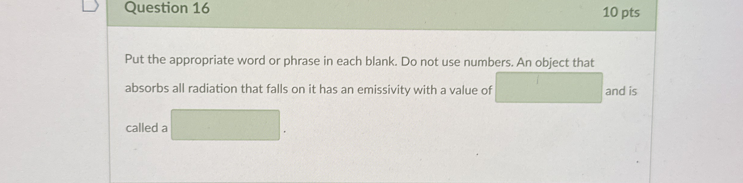 See AnswerSee Answer done loadingQuestion: Question 16Put the appropriate word or phrase in each blank. Do not use numbers. An object thatabsorbs all radiation that falls on it has an emissivity with a value ofand iscalled a