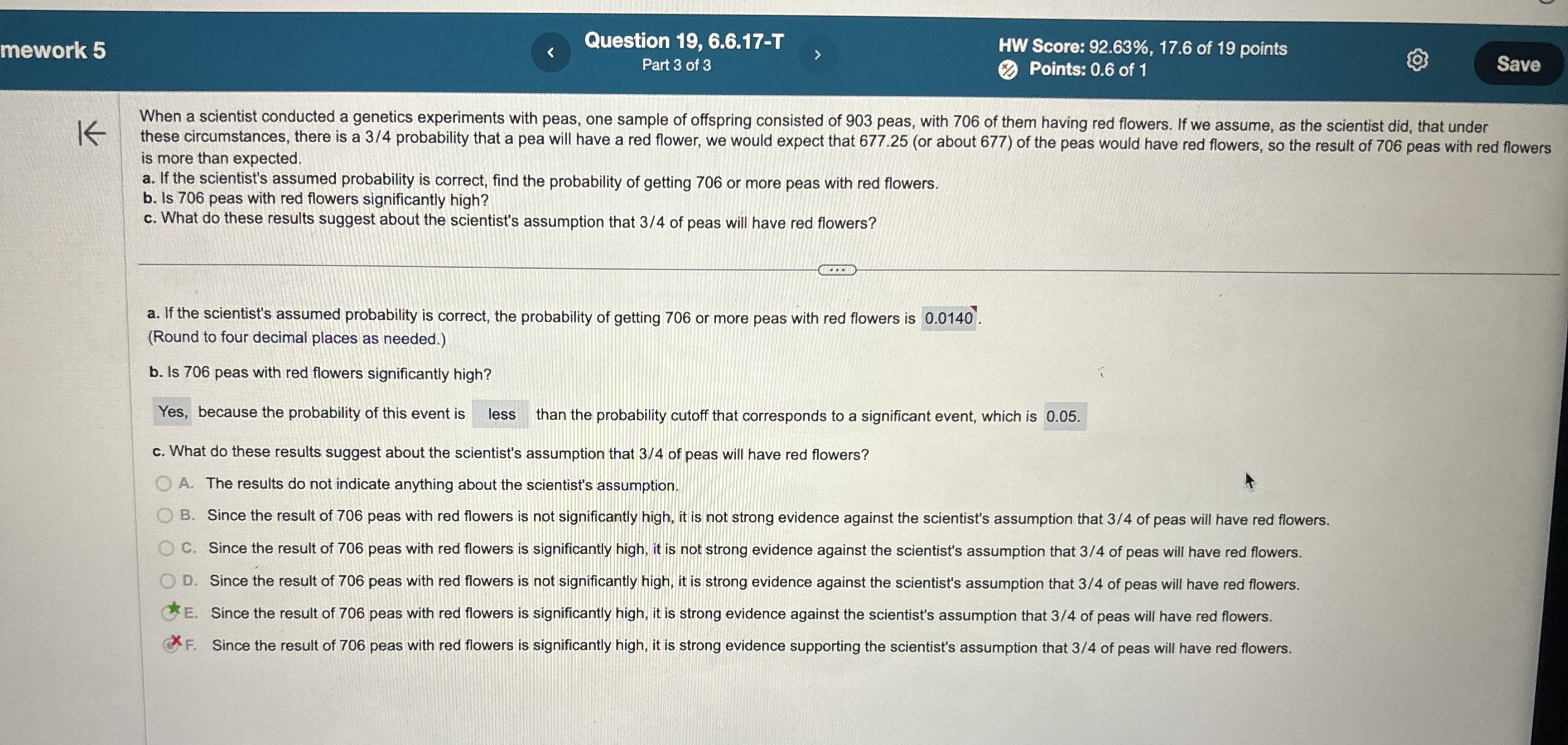 When a scientist conducted a genetics experiments with peas, one sample of offspring consisted of peas, with of them having red flowers. If we assume, as the scientist did, that underthese circumstances, there is a probability that a pea will have a red flower, we would expect that or about of the peas would have red flowers, so the result of peas with red flowersis more than expected.a If the scientist's assumed probability is correct, find the probability of getting or more peas with red flowers.b Is peas with red flowers significantly high?c What do these results suggest about the scientist's assumption that of peas will have red flowers?a If the scientist's assumed probability is correct, the probability of getting or more peas with red flowers isRound to four decimal places as needed.b Is peas with red flowers significantly high?because the probability of this event isthan the probability cutoff that corresponds to a significant event, which isc What do these results suggest about the scientist's assumption that of peas will have red flowers?A The results do not indicate anything about the scientist's assumption.B Since the result of peas with red flowers is not significantly high, it is not strong evidence against the scientist's assumption that of peas will have red flowers.C Since the result of peas with red flowers is significantly high, it is not strong evidence against the scientist's assumption that of peas will have red flowers.D Since the result of peas with red flowers is not significantly high, it is strong evidence against the scientist's assumption that of peas will have red flowers.E Since the result of peas with red flowers is significantly high, it is strong evidence against the scientist's assumption that of peas will have red flowers.F Since the result of peas with red flowers is significantly high, it is strong evidence supporting the scientist's assumption that of peas will have red flowers.- This question hasn't been solved yet!Not what you’re looking for?Submit your question to a subject-matter expert.