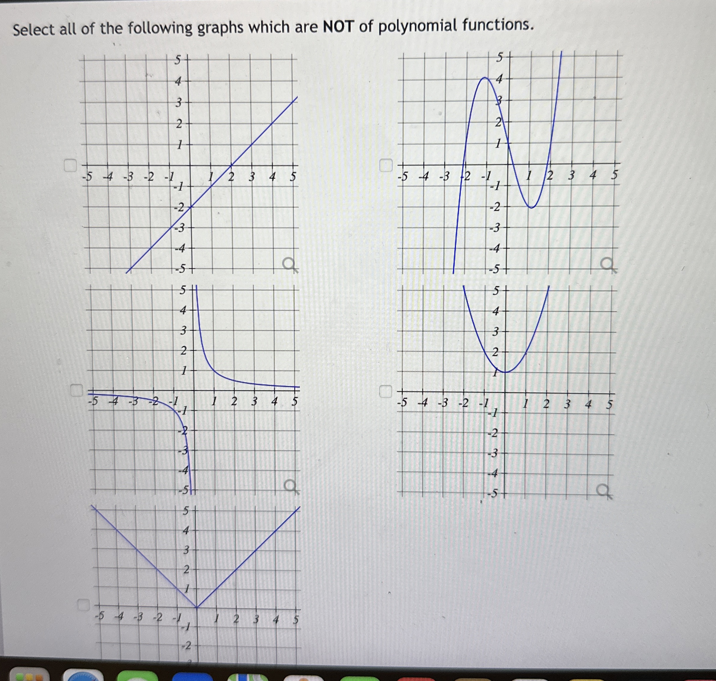 Select all of the following graphs which are NOT of polynomial functions.- This question hasn't been solved yet!Not what you’re looking for?Submit your question to a subject-matter expert.