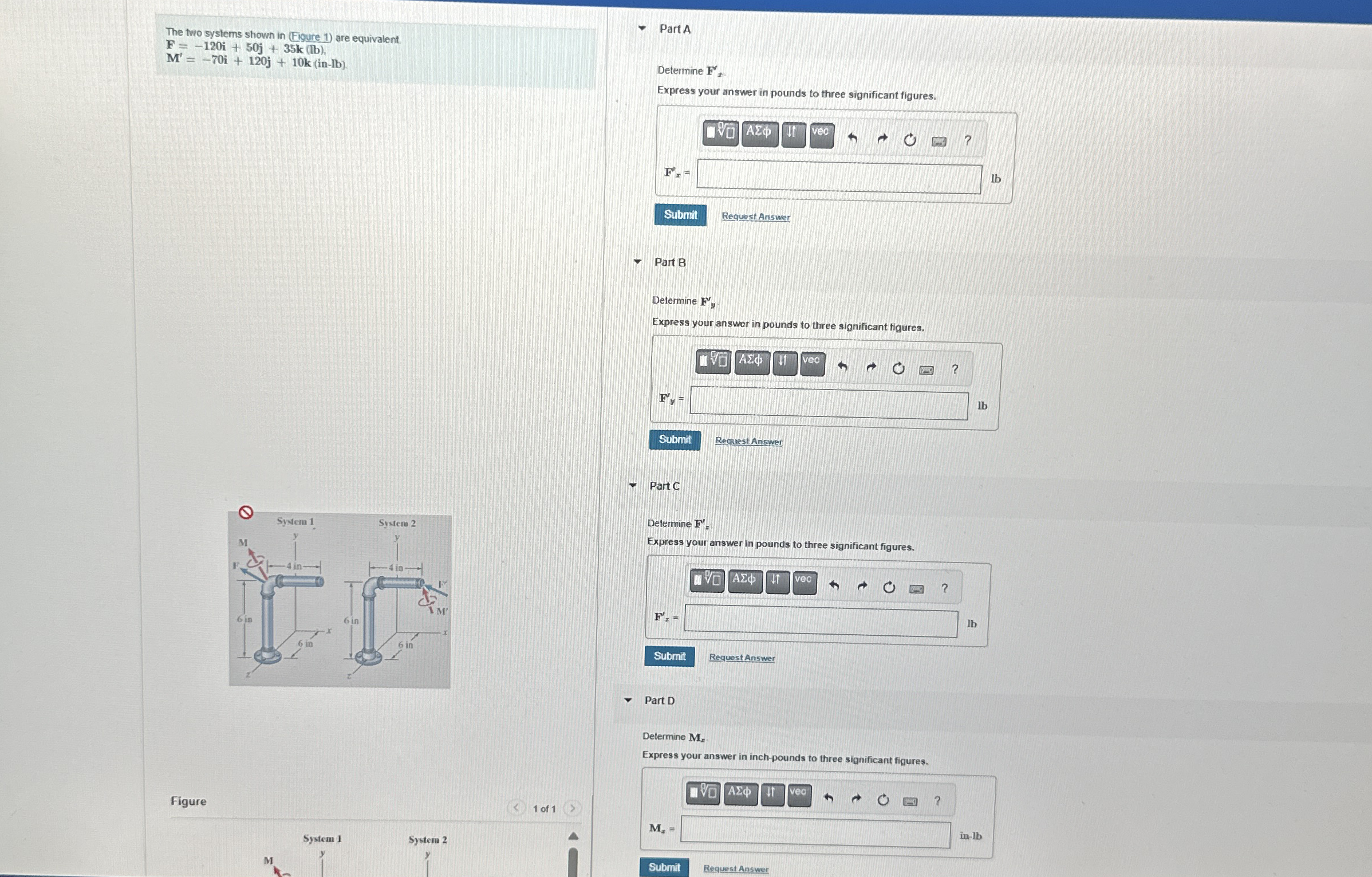 Question: The two systems shown in (Figure 1) are equivalentF=-120i+50j+35k(lb)M'=-70i+120jM'=-70i+120j+10k(in-lb)Part ADetermine F**'.Express your answer in pounds to three significant figures.Part BDetermine F',Express your answer in pounds to three significant figures.Request AnswerPart CDetermine F',Express your answer in pounds to three significant figures.Part